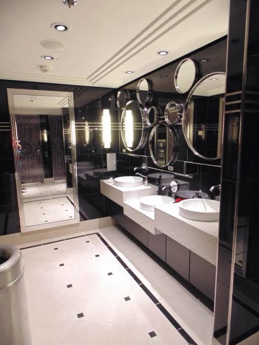 And then it was time for a walk through the adult, nighttime lounges. Wow! The details are just incredible! She explained how each of the restrooms all around the ship are themed. We were able to see the men/womens restrooms in the cave-like hallway near the Tube. They are themed like the bullfighter and the flamenco dancer. I only took photos of the womens room :)